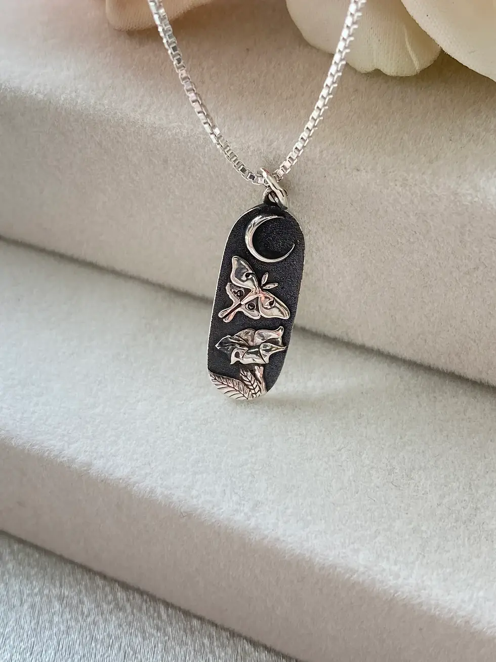Luna Moth with Moon Flower Necklace in Sterling Silver