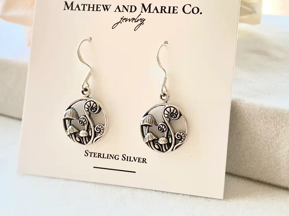 Sterling Silver Mushroom and Fiddlehead Ferns Earrings