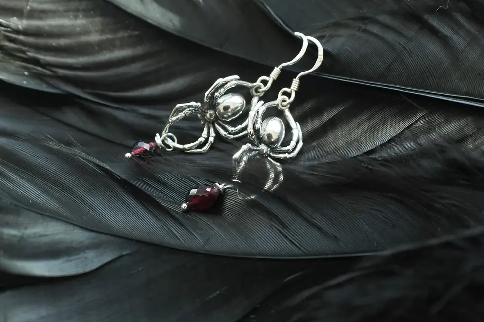 Sterling Silver Spider with Garnet Gemstone Earrings