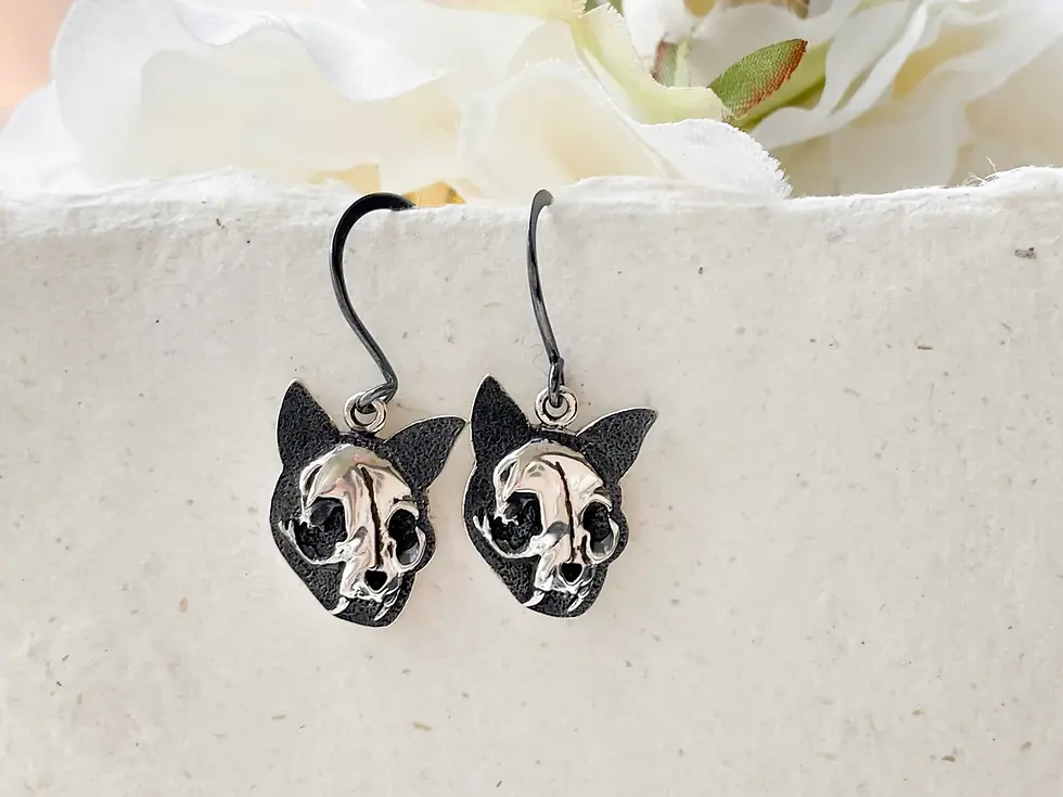 Sterling Silver Cat Skull with Flower Staple Chain Necklace