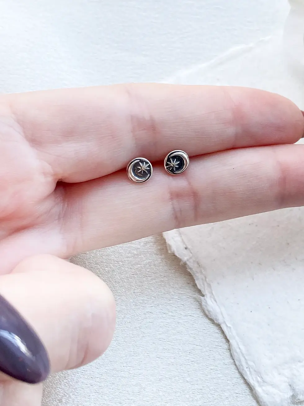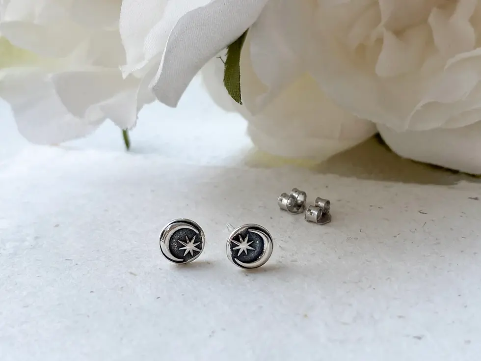 Tiny Sterling Silver Crescent Moon and Star Stud Earrings